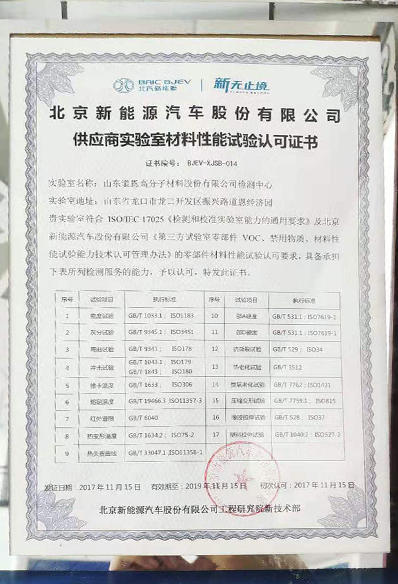 北京新能源汽車股份有限公司供應(yīng)商實驗室材料性能試驗認(rèn)可證書