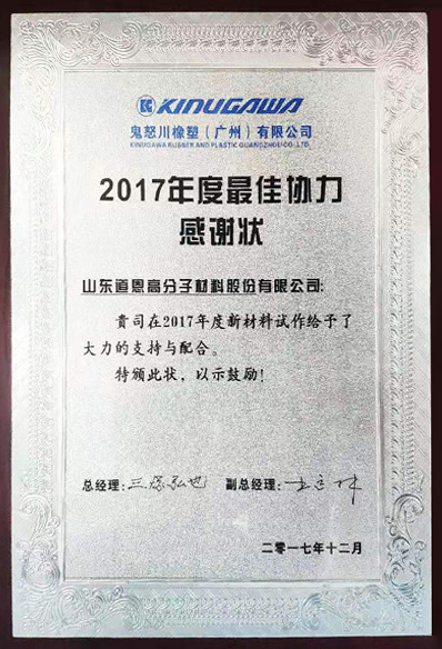 鬼怒川橡塑(廣州)2017年度最佳協(xié)力感謝狀