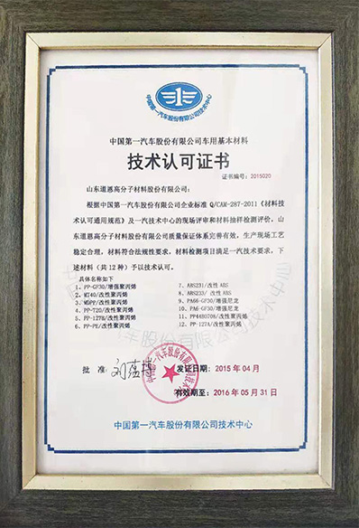 中國第一汽車股份有限公司車用基本材料技術(shù)認可證書