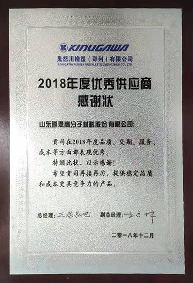 鬼怒川橡塑(鄭州)2018年度優(yōu)秀供應(yīng)商感謝狀